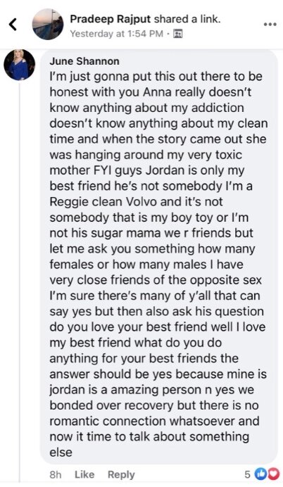 “FYI guys Jordan is only my best friend,” June wrote on Facebook. “It’s not somebody that is my toy boy or I’m not his sugar mama we r friends.”